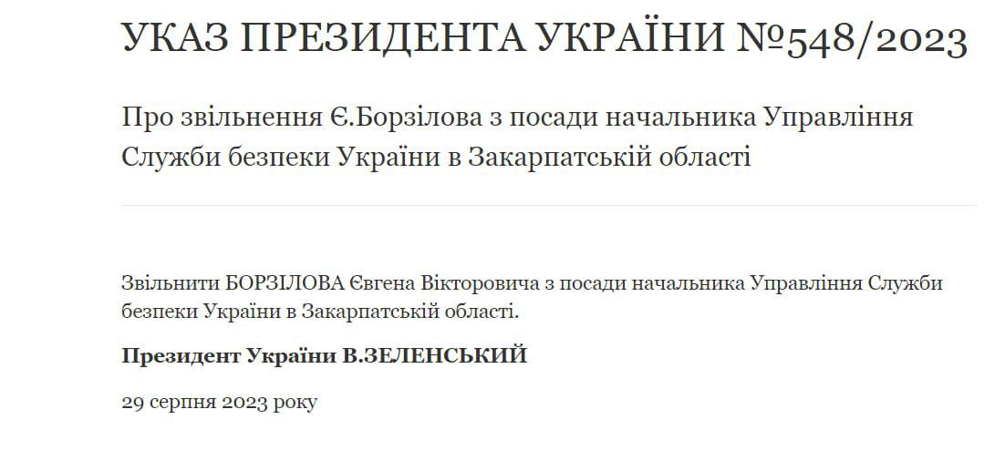 "Звільнити Борзілова Євгена Вікторовича з посади начальника Управління Служби безпеки України в Закарпатській області", - йдеться в указі.