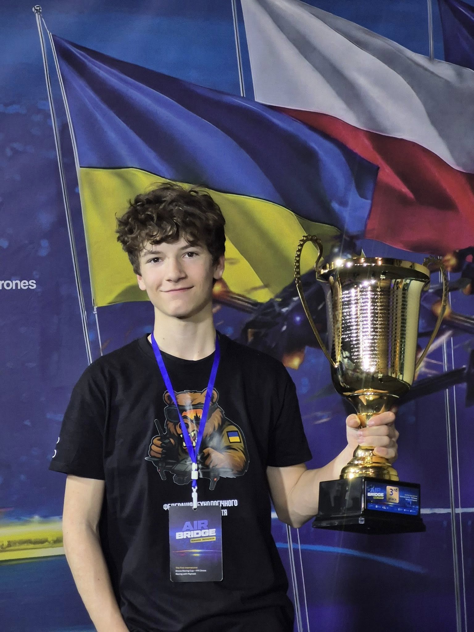 13-річний ужгородець Назар Токар став бронзовим призером AIR BRIDGE – першого міжнародного турніру з дрон-рейсингу в унікальній дисципліні FPV Drone Racing with Payload. Змагання відбулися у польському Жешуві.