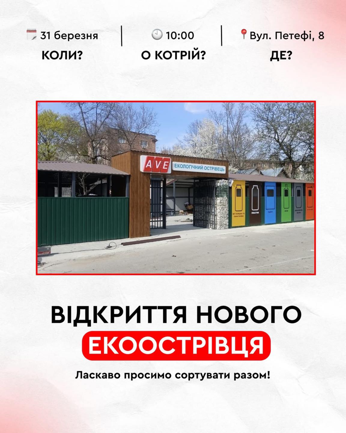 Екологічний острівець стане зручним місцем для мешканців мікрорайону, де можна буде здати на переробку різні види відходів, зокрема папір, пластик, метал, скло та використані батарейки.