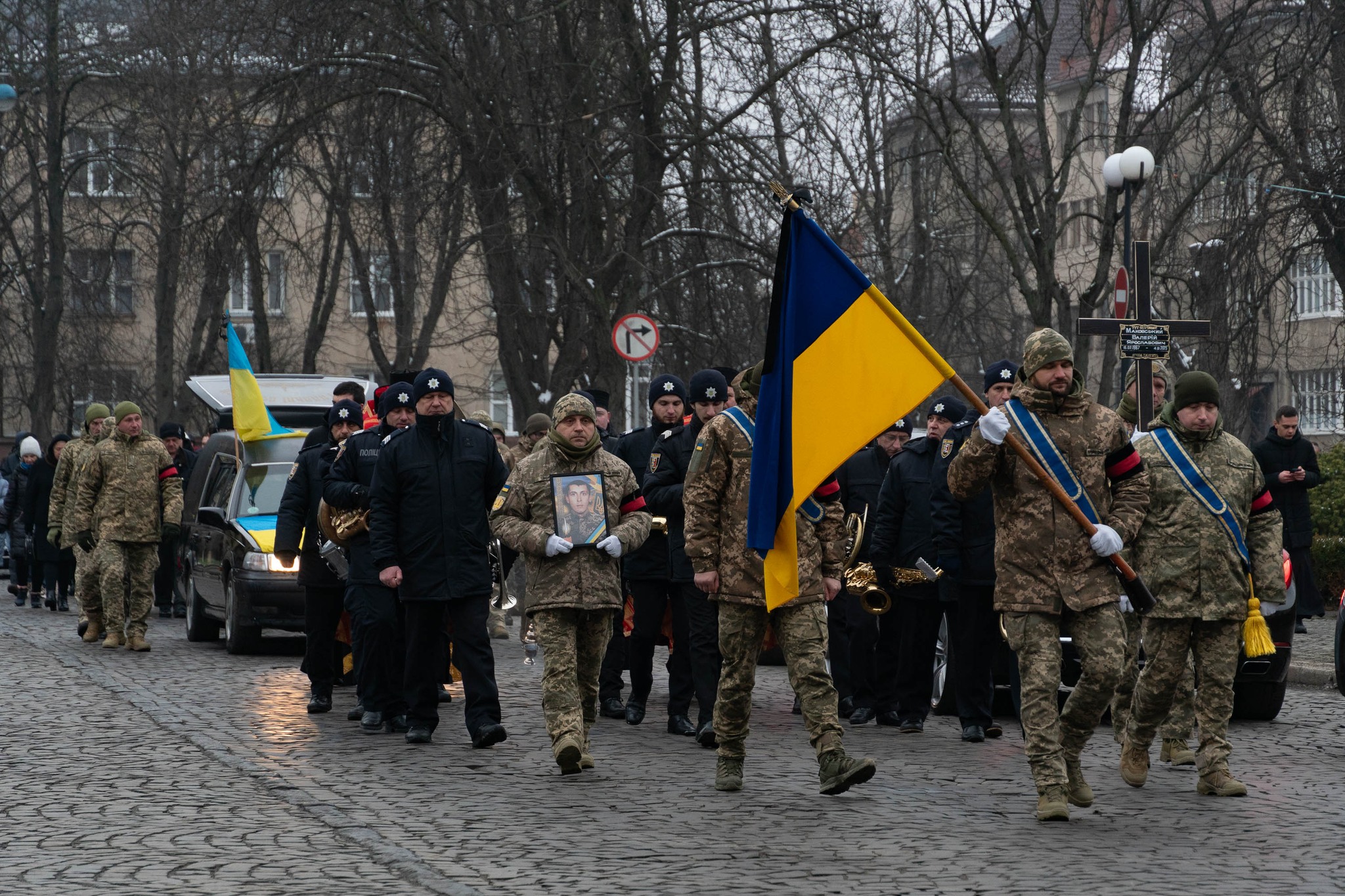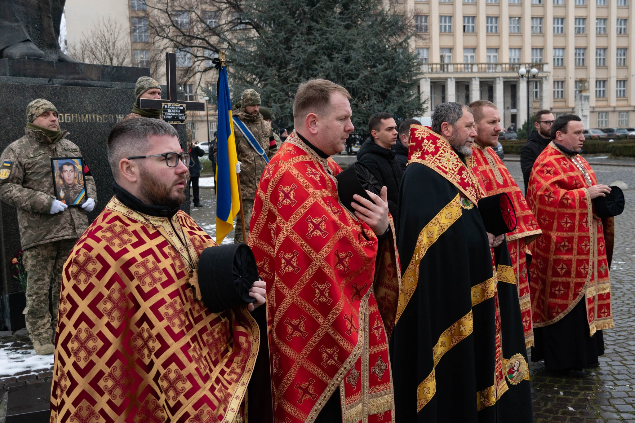 Жителі міста прощалися із воїном на площі Народній. Віддати шану захиснику прийшли рідні, друзі, міський голова Богдан Андріїв, військові.